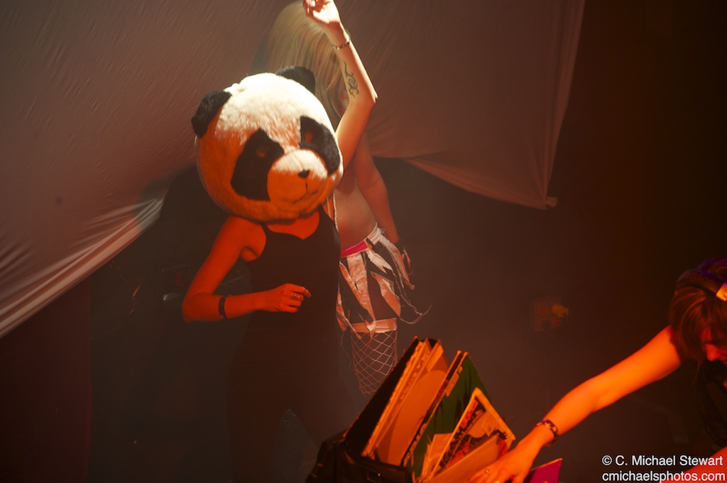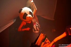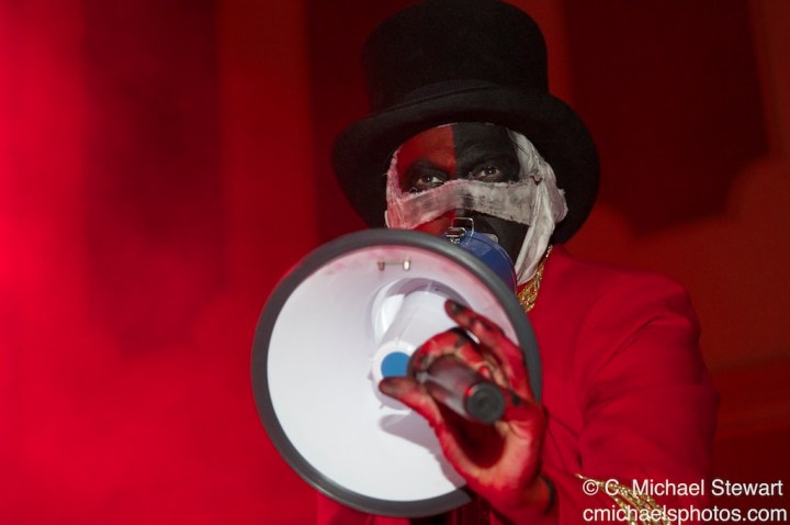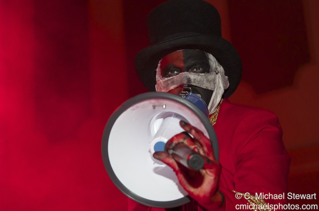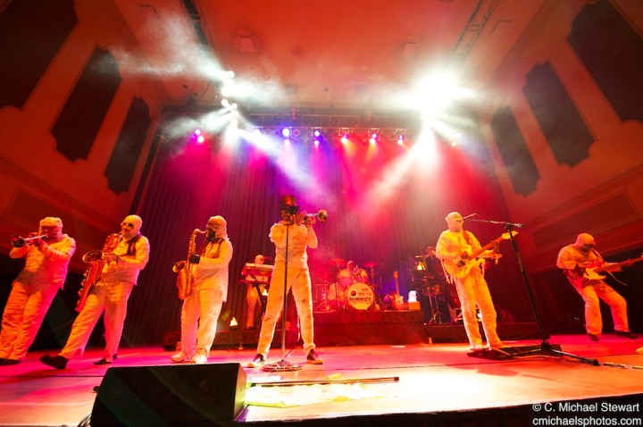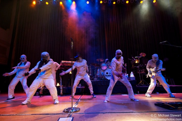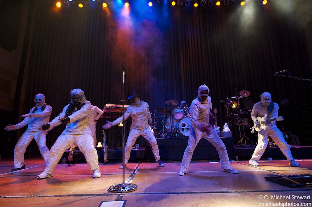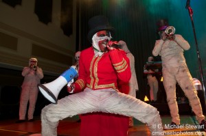 The Mummies show, began with a grand entrance, a drum line, marching in and around the crowd and on to the stage. The band had the audience in full frenzy from the beginning of their show. The funky band band consists of various professional musicians based in Nashville, Tenn. There are rumored to be several Grammy awards among the members, though this is difficult to verify, as identities are kept private. They are believed to be under contract to various record labels, hiding their identities so as to prevent contract disputes while performing.