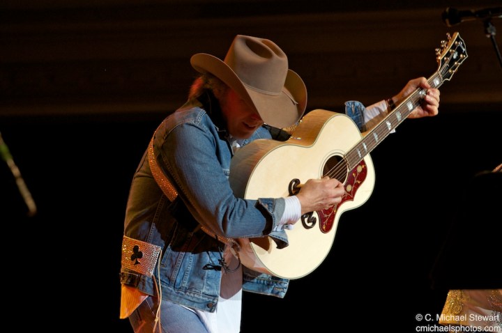 Last night at Horseshoe, Dwight Yoakam proved that Bakersfield Honky Tonk is alive and well. Rockin guitar and rapid fire nasal vocals punctuated an upbeat country sound that had the sell-out crowd dancing and singing for the entire 90 minute show. Yoakam delivered his vast catalog of hits in rapid fire succession pausing only to comment that he had family in Louisville and to let the crowd lead on “I sang Dixie”. The show was marred only by a distorted sound system and a 30 minute late start. Otherwise the party boogied on.