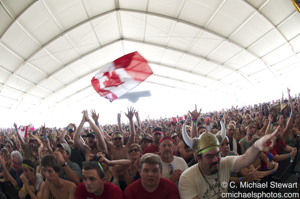 The festival attendees estimated at nearly 100,000 fought through searing heat, extreme dusty fields and crowded tents the entire weekend. Restroom lines where long and free water was at a premium. Fans waited as long as nine hours for a prime spot in front of the stage for their favorite bands. The daytime crowd outside the main stage was estimated at 50,000 for Mumford and Sons at the Which Stage.