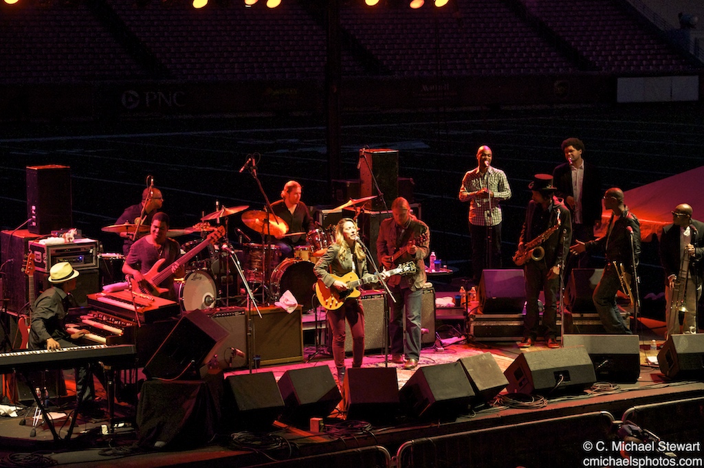 From the opening number , “Don’t Let Me Slide” it was obvious the this would be a special night. The combination of Susan Tedeschi’s stunning vocals and Derek Trucks extraordinary guitar, lead a spectacular eleven-member ensemble overflowing with talent and musical familiarity. Harmony singers Mike Mattison and Mark Rivers joined forces with brothers Oteil Burbridge (noted for his years as bassist with the Allman Brothers Band) and Kofi Burbridge (longtime keyboardist/flutist with The Derek Trucks Band),along with a pair of drummers J. J. Johnson and Tyler Greenwell, The band also included a brass section consisting of trumpeter Maurice Brown, tenor saxophonist Kebbi Williams, and trombonist Saunders Sermons.
